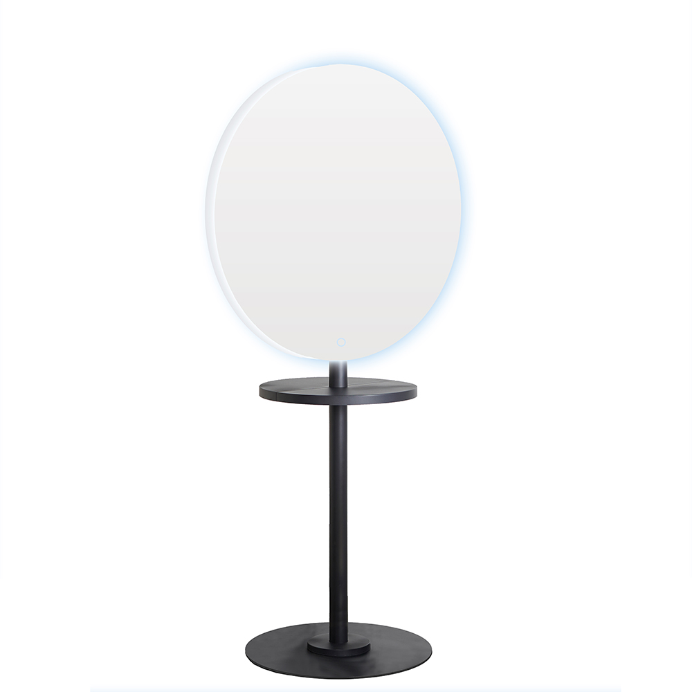 - Modern Aesthetic: The Circa LED Round Salon Mirror is a stunning focal point with its black metal frame against the black pole frame.