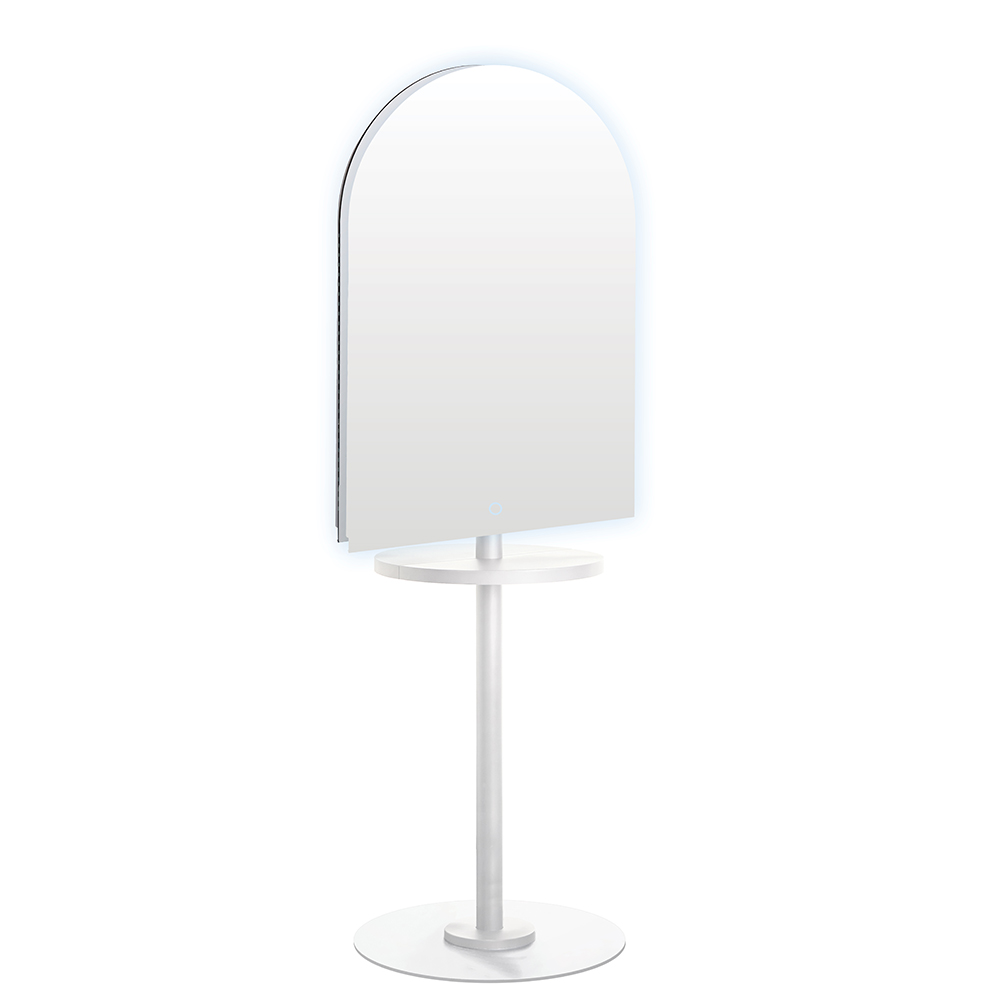 - Modern Aesthetic: The Arch LED II Salon Mirror is a stunning focal point against the white pole frame.