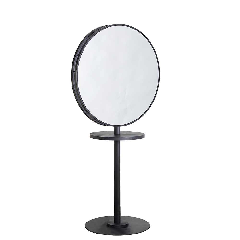 - Modern Aesthetic: The Nero Black Round Salon Mirror is a stunning focal point with its black metal frame against the black Pole frame.